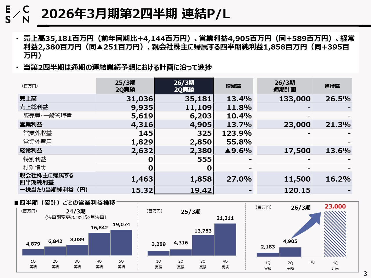 まず、決算概要についてご説明します。2026年3月期第2四半期の連結P/Lです。売上高は351億8,100万円、経常利益は23億8,000万円となりました。前年同期と比較すると、売上高、営業利益は増加しているものの、経常利益は減少しています。通期計画に関しては順調に進捗している状況です。
