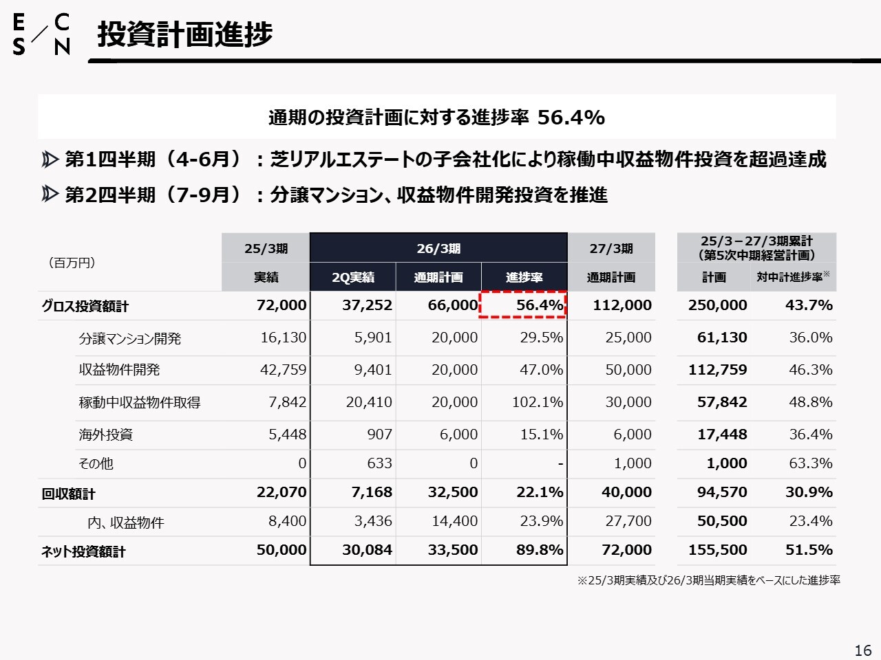 投資計画の進捗についてです。第5次中期経営計画は、現在2年目に入っています。3年間のグロス投資額は、スライドの表の右から2列目に記載のとおり、2,500億円を計画しています。現在は3年間のうち1.5年目が完了し、今期26年3月期の単年度計画に対する進捗率は56.4パーセントと順調に推移しています。