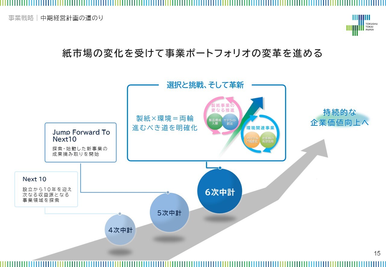 第4次中期経営計画で探索した新事業領域は、第5次中期経営計画で収穫の段階に入り、今年度に最終年を迎える第6次中期経営計画においては、成長に向けた道筋を製紙と環境という両輪であると明確にし、持続的な企業価値の向上に取り組んでいます。
