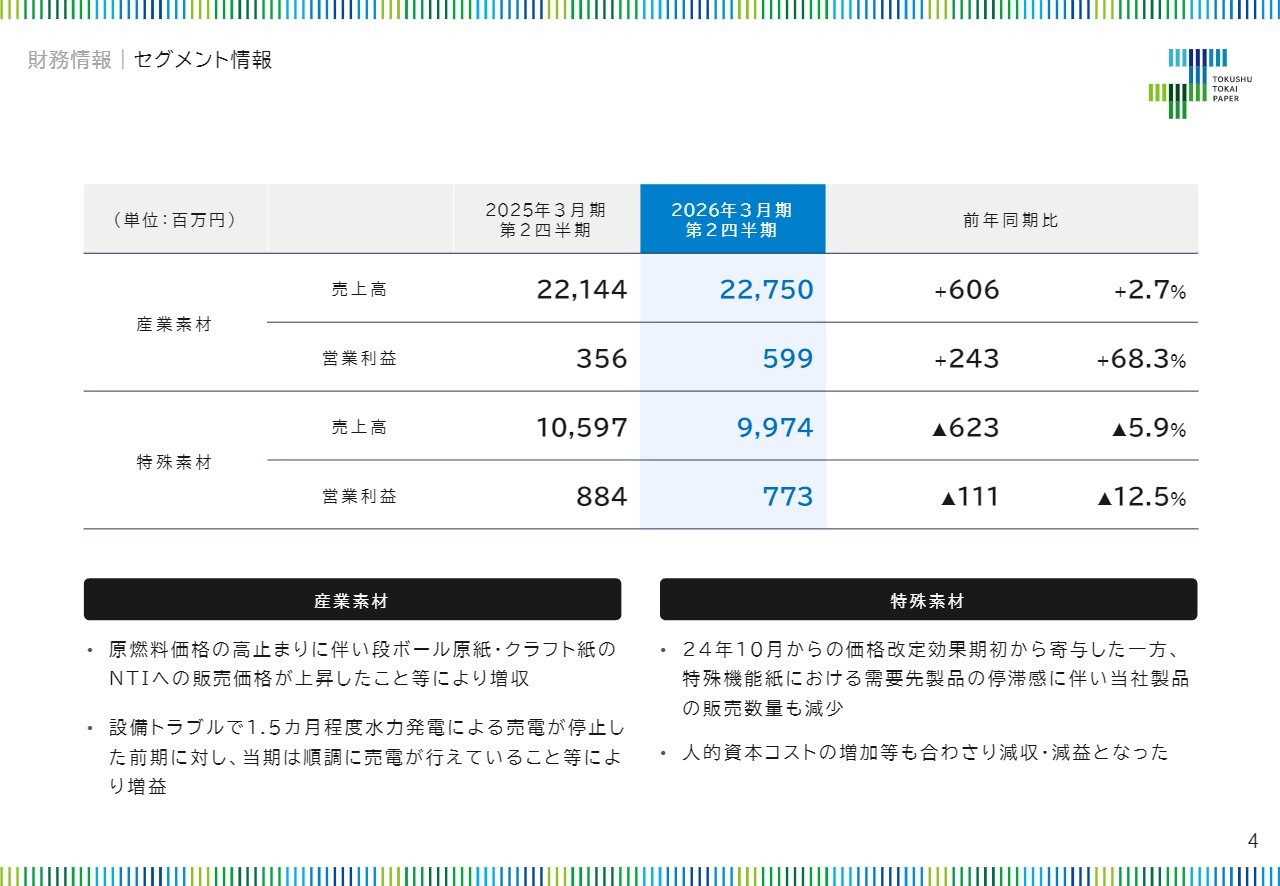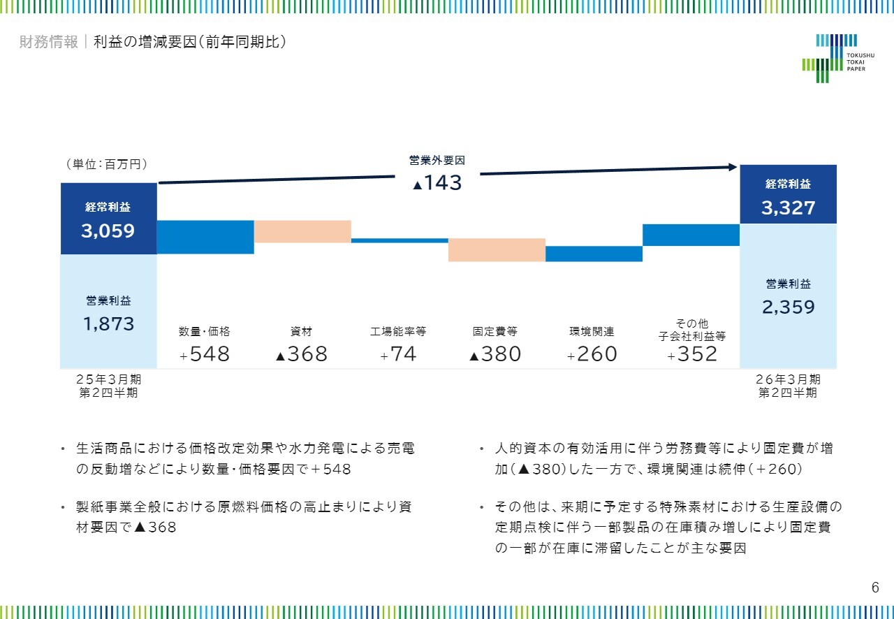 特殊素材セグメントでは、先期10月からの価格改定効果が期初から現れましたが、特殊機能紙の数量減によってその効果が相殺されました。一方で、生活商品セグメントでは、ペーパータオルやトイレットペーパーの価格改定効果が期初から反映されたことに加えて、堅調な数量に支えられた結果、数量・価格要因により5億4,800万円を押し上げました。さらに、引き続きの資材関係のコスト増加による3億6,800万円は吸収しました。