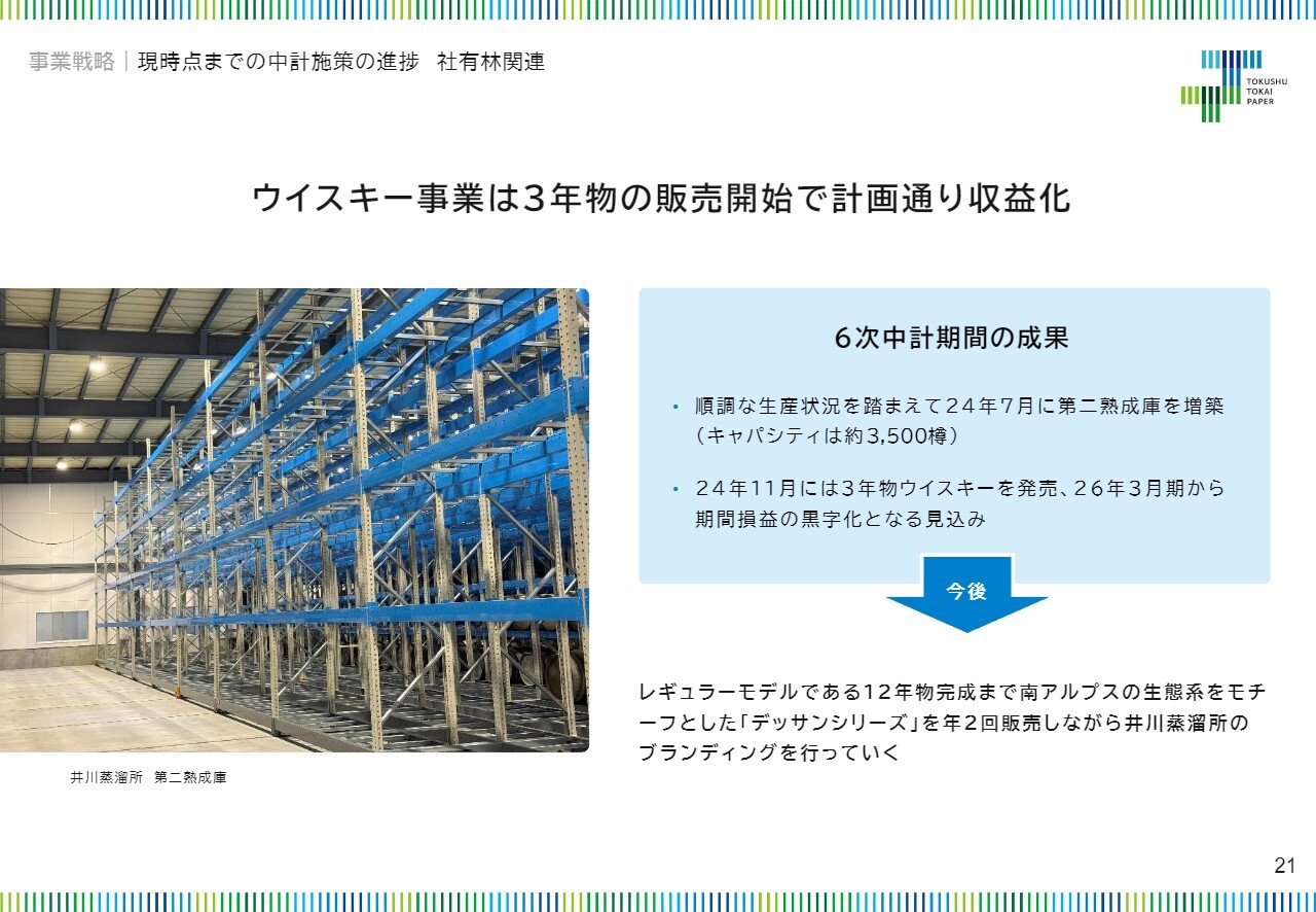 環境関連セグメントに含まれるウイスキー事業については、生産状況が順調であることを踏まえ、2024年7月には熟成庫を増設する予定です。また、昨年より3年物の販売を開始しました。