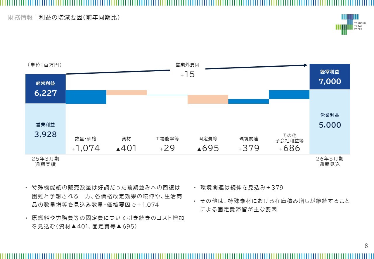この着地見込みにおける営業利益と経常利益の見通しについてお話しします。数量および価格要因として、需要先の製品が踊り場となっている特殊機能紙の販売数量減少については、第3四半期より回復の兆しが見られるものの、好調だった前期ほどの数量回復は見込んでいません。