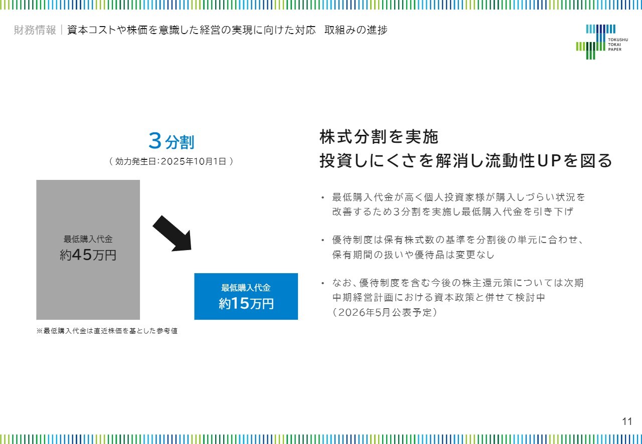 まず、売買代金の改善に向けた取り組みとして、より投資しやすい環境を整えるために、1株から3株への株式分割を実施しました。