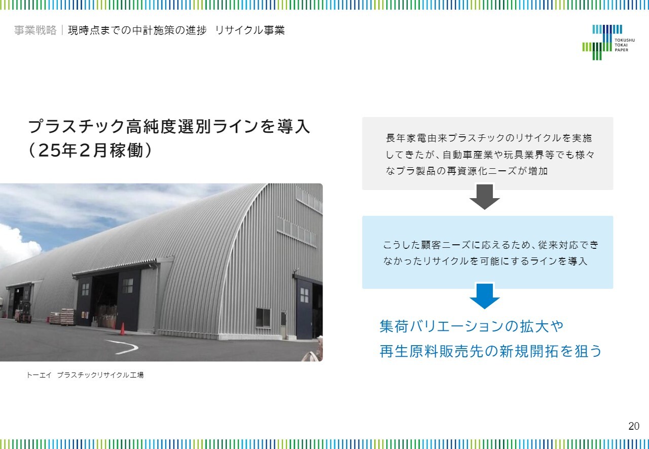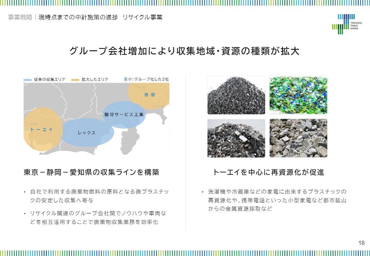 一方で、スライドの図の右上に位置する重点分野であるリサイクル事業については、当中期経営計画期間中に新たに2社をグループ会社化したほか、事業拡大を目的とした設備投資を行い、順調に事業領域を拡大させています。