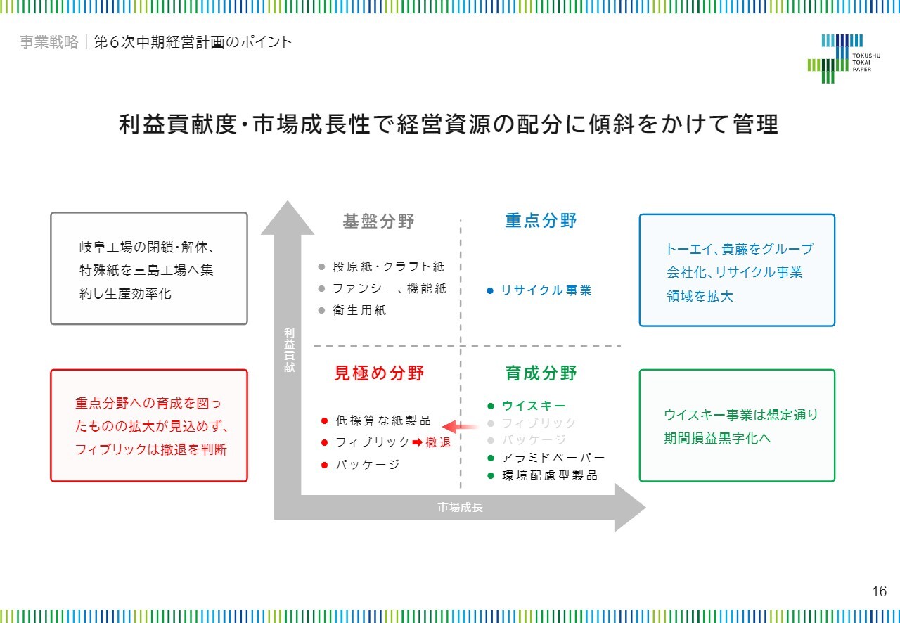 スライドの4象限の左上にある基盤分野として位置づけている特殊素材セグメントにおいて、ファンシーと記載する色や風合いをつけた紙は需要が縮小していることから、岐阜工場を閉鎖し、三島工場へ集約することで基盤の強化を図りました。
