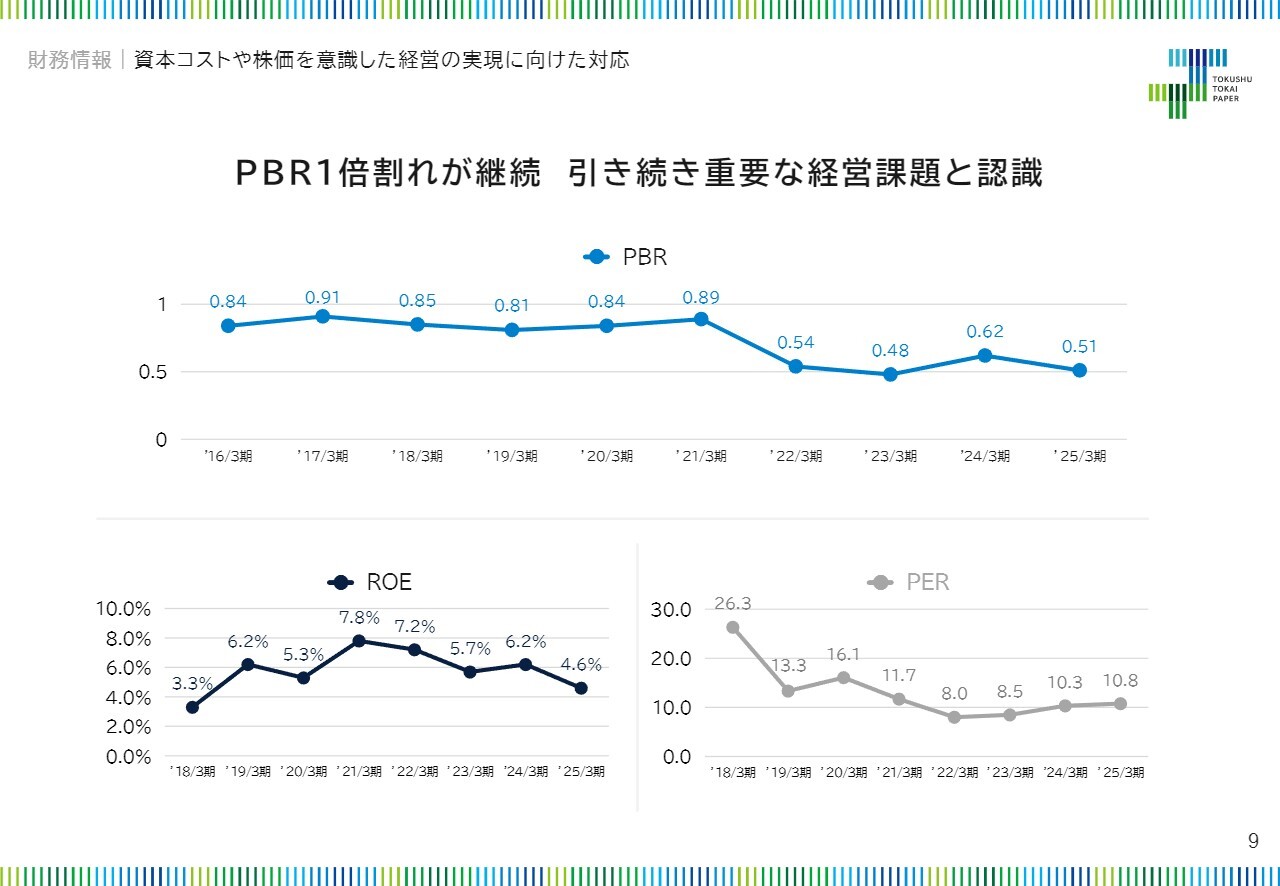 続きまして、資本コストや株価を意識した経営の実現に向けた対応についてご説明します。現在、当社のPBRが1倍を下回る状況が続いており、これを重要な経営課題と認識しています。