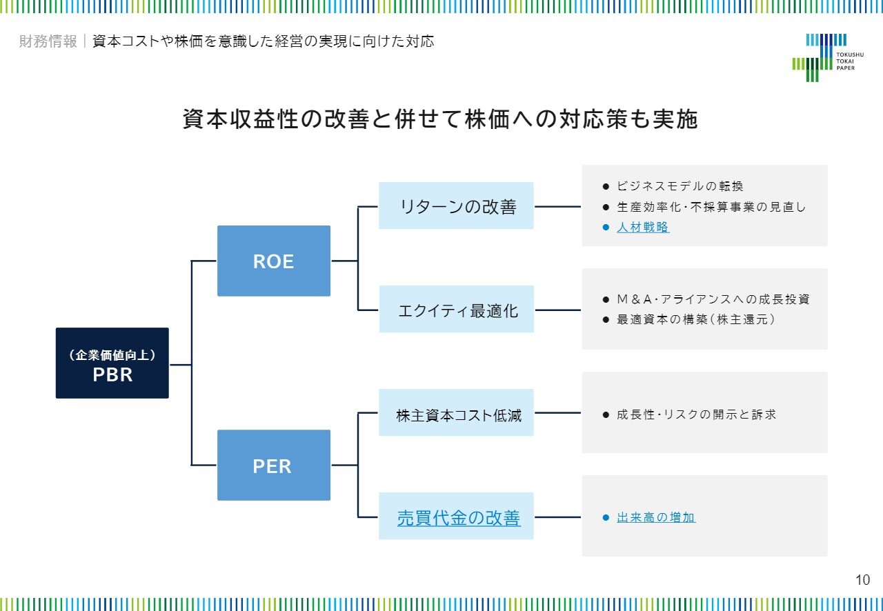 こちらのスライドは、今年2月に開始したロジックツリーです。ここでは、PBR改善に向けて資本収益性の向上を図るとともに、資本市場との対話を通じた株主資本コストの低減や、売買代金の改善による市場評価の向上に取り組むことを示しました。