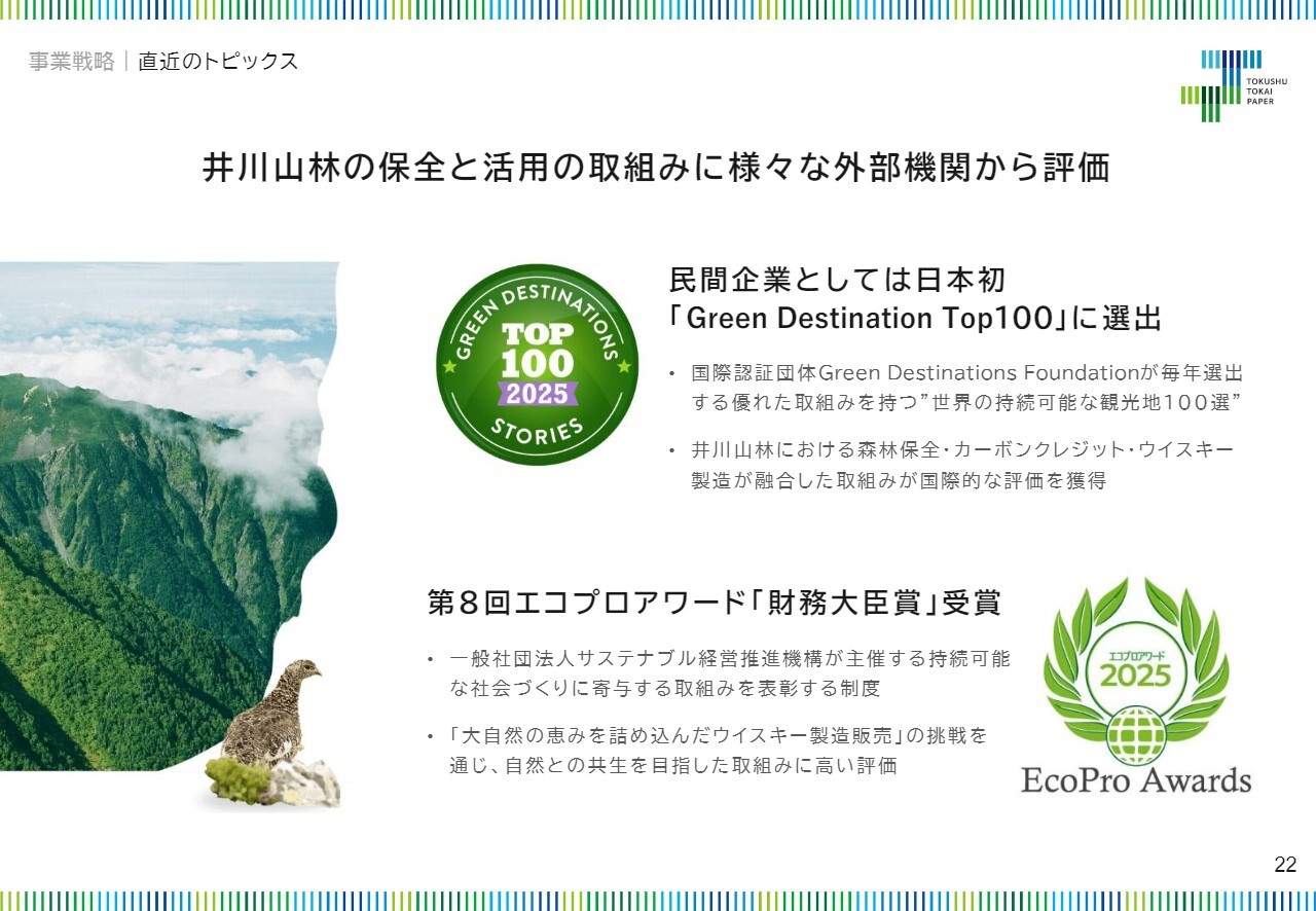このような取り組みに対してさまざまな評価をいただいており、直近では「世界の持続可能な観光地TOP100選(Green Destinations Top 100)」に井川社有林が選出されたほか、「エコプロアワード」において最高位である「財務大臣賞」を受賞しました。引き続き、豊かな南アルプスの生態系を守りながら、自然との共生に向けた活動を続けていきます。