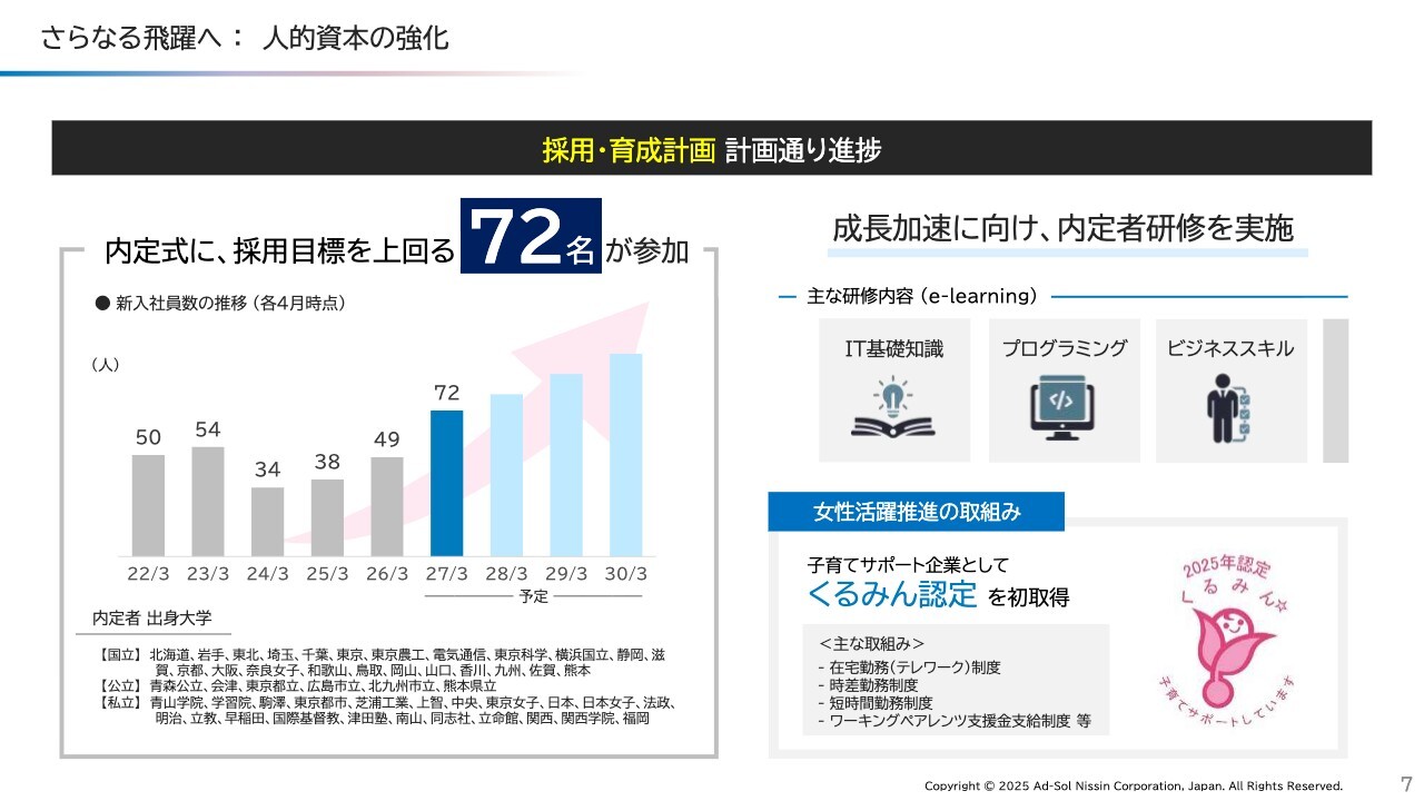次世代SIビジネスモデル、ひいては企業の成長を支えるのは人的資本です。新卒採用では、当初の採用予定人数70名を上回る72名が内定しています。