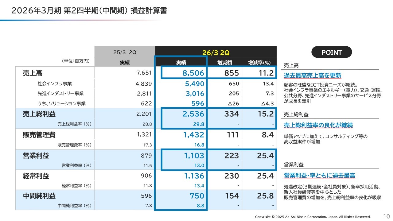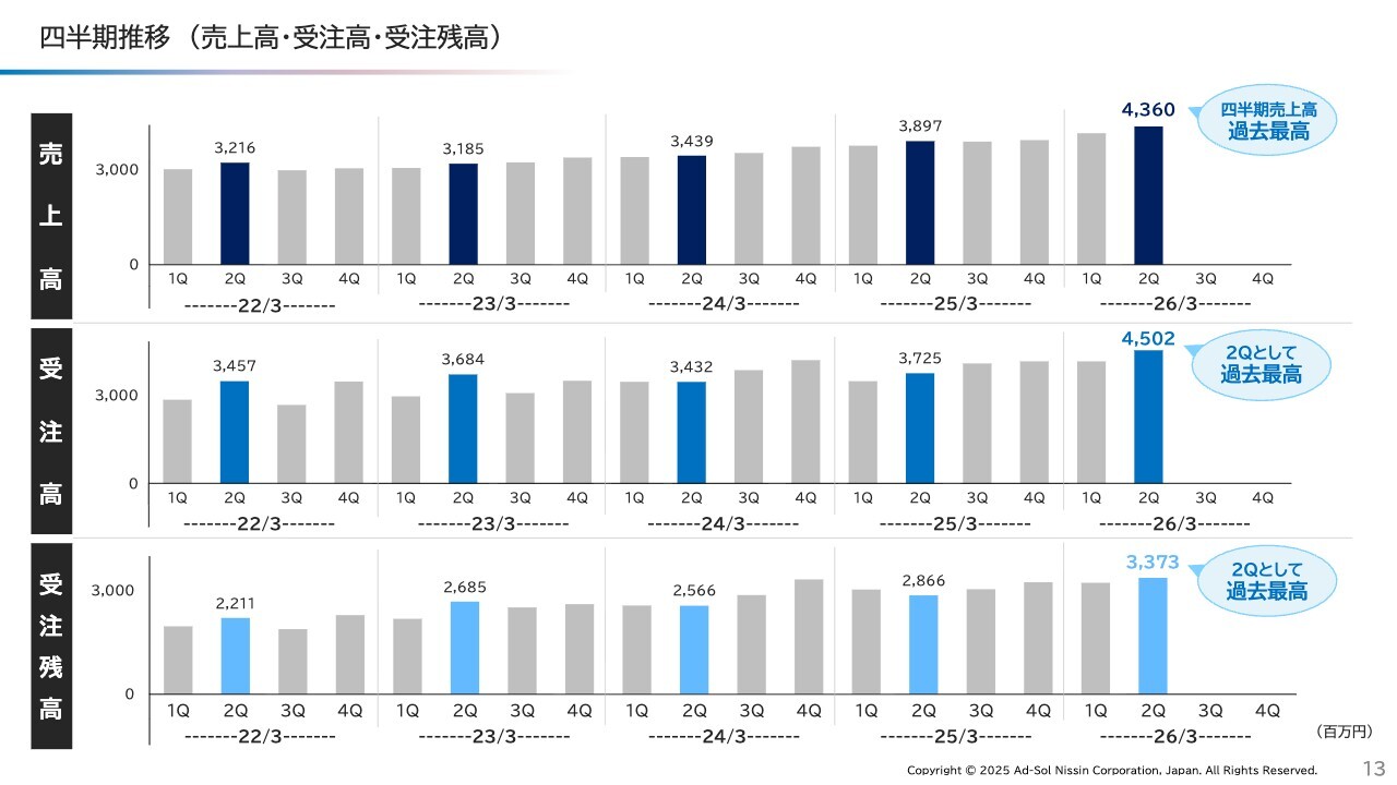 四半期業績では、売上高がすべての四半期を通じて過去最高を記録し、受注高・受注残高も第2四半期として過去最高となりました。