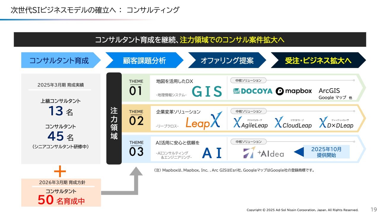 コンサルティングやオファリング提案を含む上流工程の強化、さらに「+AIdea(プラスアイディア)」や「LeapX(リープクロス)」、GIS(地理情報システム)をはじめとしたソリューション拡充により、開発業務以外の売上比率を大きく伸ばすことが収益性の向上につながると考えています。