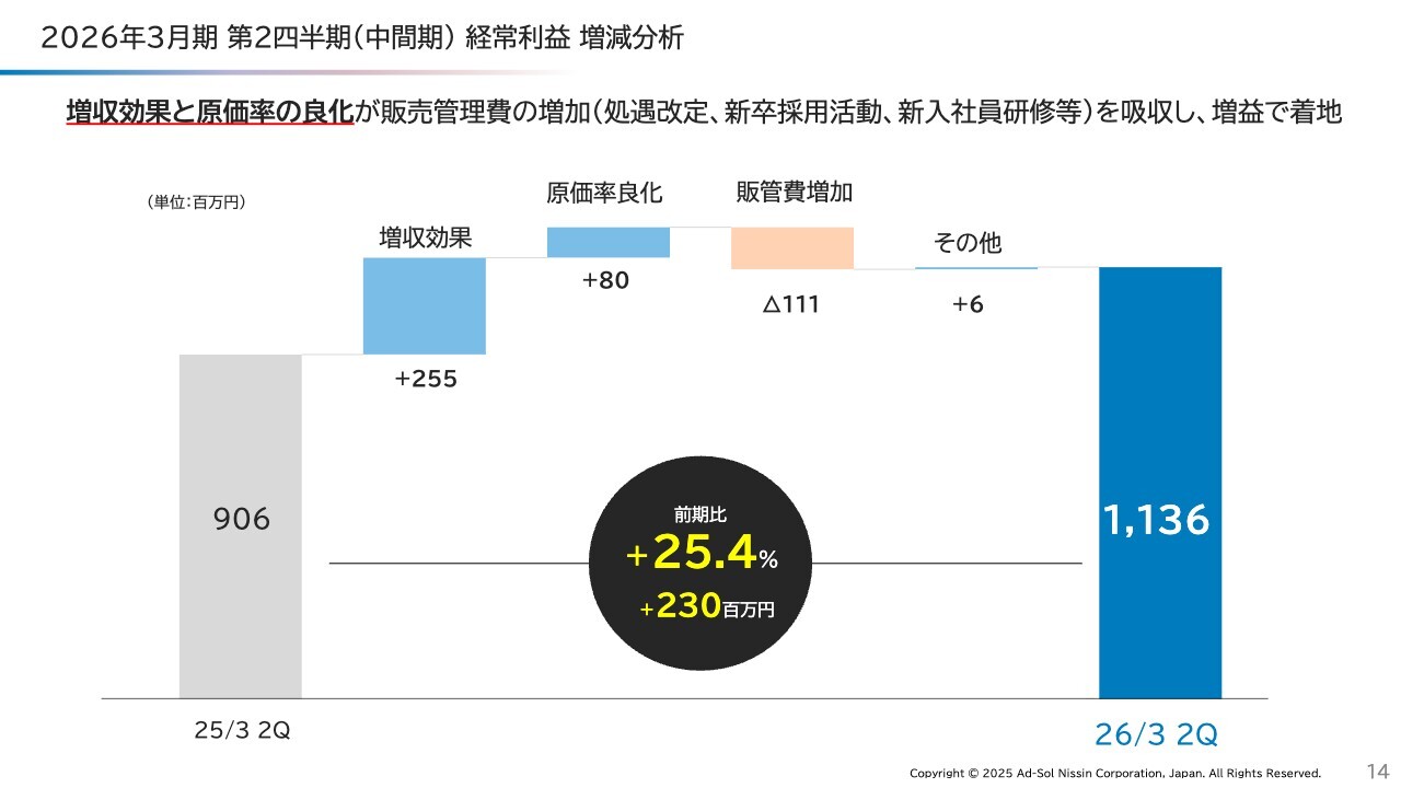 次に、経常利益の分析です。増収効果や原価率の改善が販売管理費の増加を上回り、前年同期比25.4パーセント増の11億3,600万円となりました。