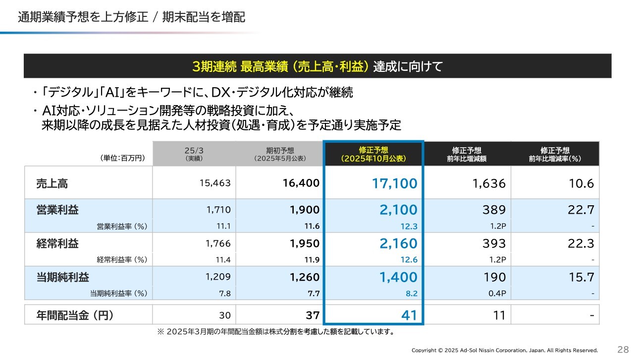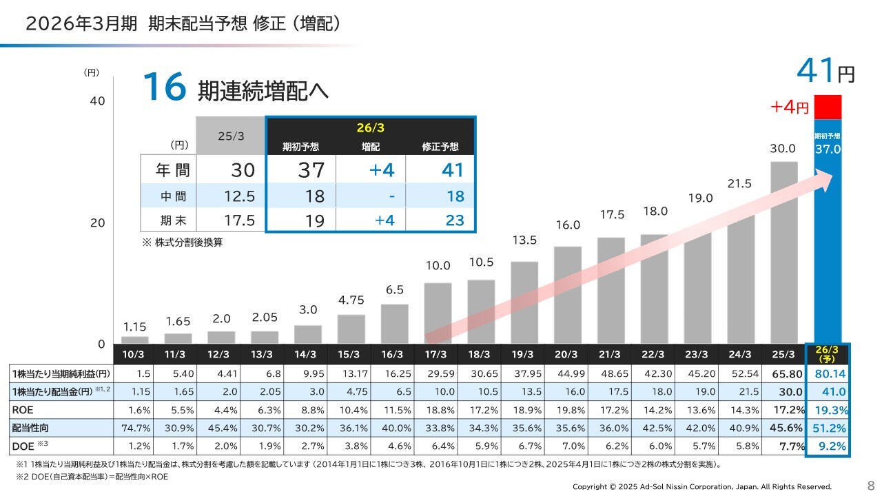 なお、株主還元については、業績予想の上方修正に合わせ、今期の期末配当の増配を発表しました。年間配当金は期初予想から4円増配、前期比11円増配となる41円を予定しており、これにより16期連続増配を達成する見込みです。