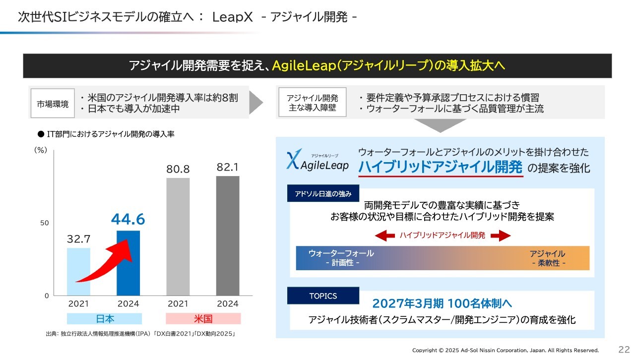 今後は日本にも到来すると予測されるアジャイル導入の波を確実に捉えるため、当社は「AgileLeap(アジャイルリープ)」の強化に取り組んでいます。