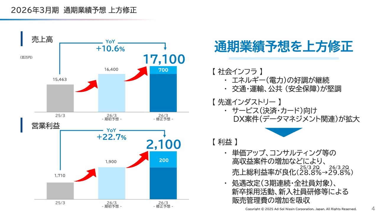今期は、エネルギー分野の電力領域やサービス分野の決済・カード領域を中心に、システム刷新やDX案件が非常に好調に推移しています。これらの事業環境を踏まえ、通期の売上高を171億円に上方修正しました。