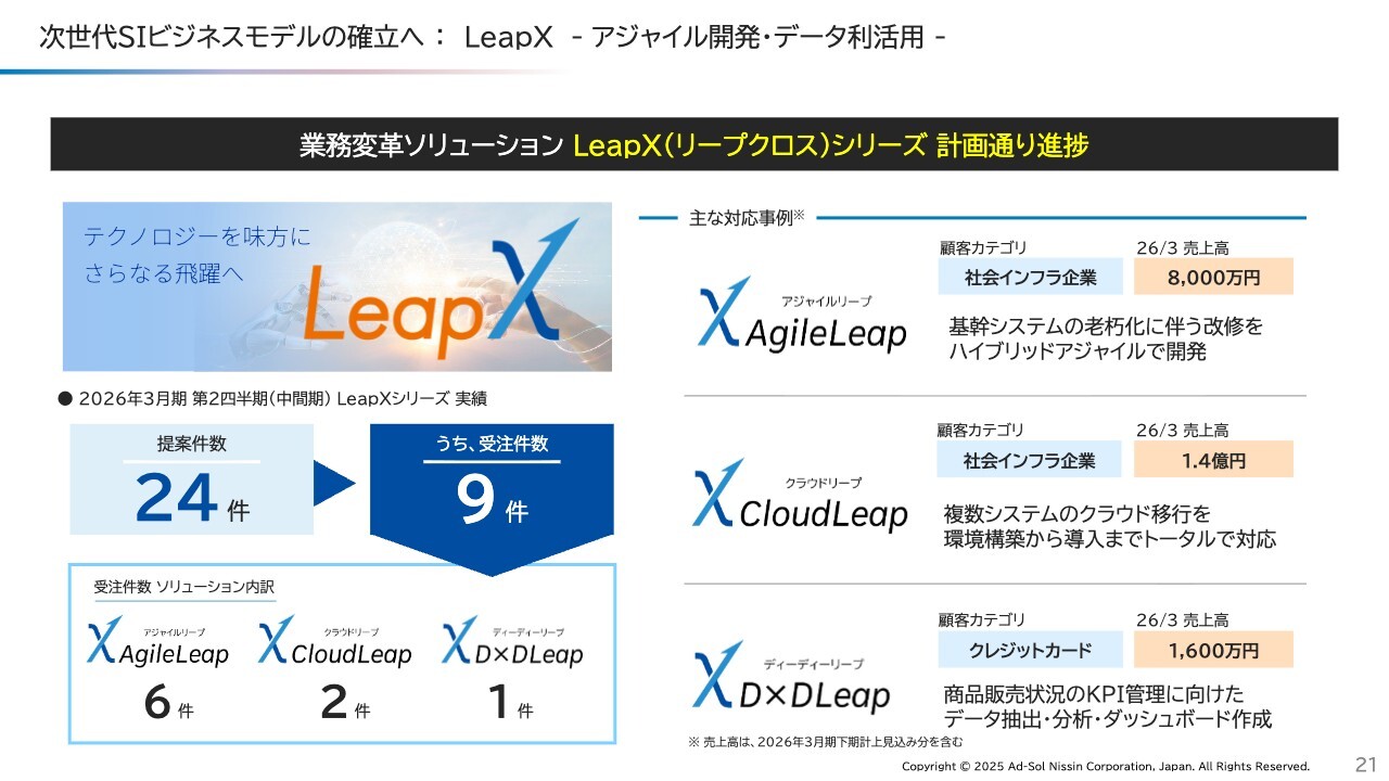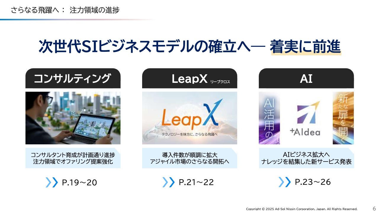 詳細については後ほどあらためてご説明しますが、コンサルティング、システム開発の新サービスである「LeapX(リープクロス)」、AIコンサルティングとエンジニアリングの新サービスである「+AIdea(プラスアイディア)」、それぞれで着実に成果が出てきています。