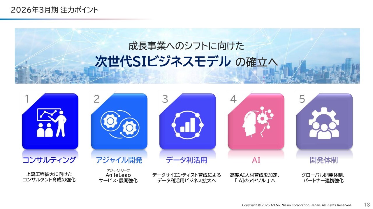 続いて、成長戦略の進捗についてご説明します。冒頭でも触れましたが、次世代SIビジネスモデルの確立に向け、今期はスライドの5つのポイントに注力しています。今回はこのうち、コンサルティング、アジャイル開発、AIについてご説明します。