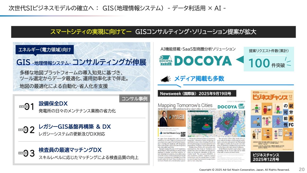 GISは、電力領域を中心に、社会インフラ企業におけるニーズが高まっており、設備保全やレガシーシステムのDXにおいて複数のコンサルティング案件が進行中です。