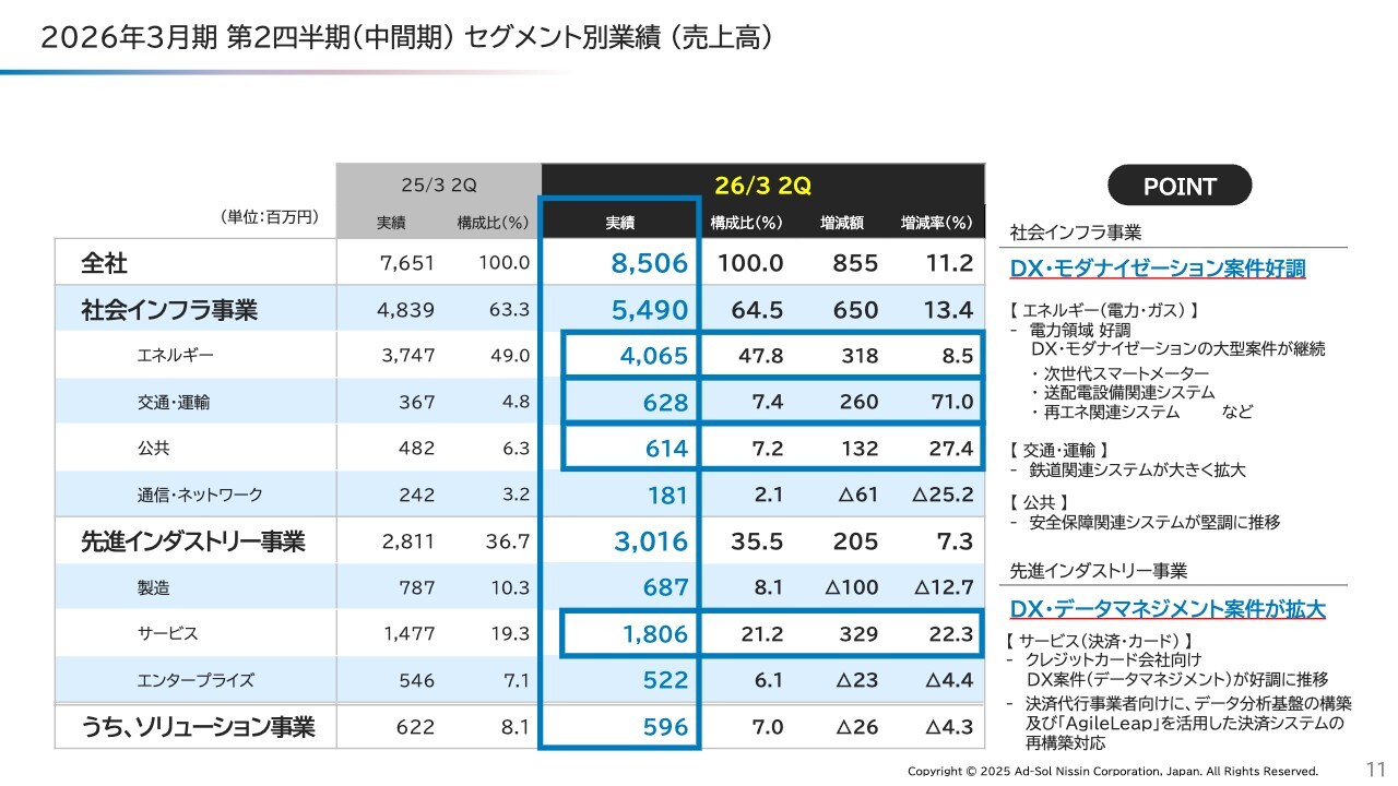 先進インダストリー事業の売上高は、前年同期比7.3パーセント増収の30億1,600万円となりました。これは、サービス分野の決済・カード領域において、DX・データマネジメント案件が引き続き拡大したことによるものです。