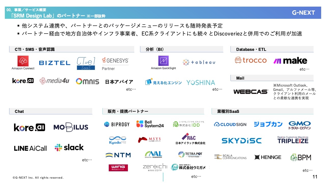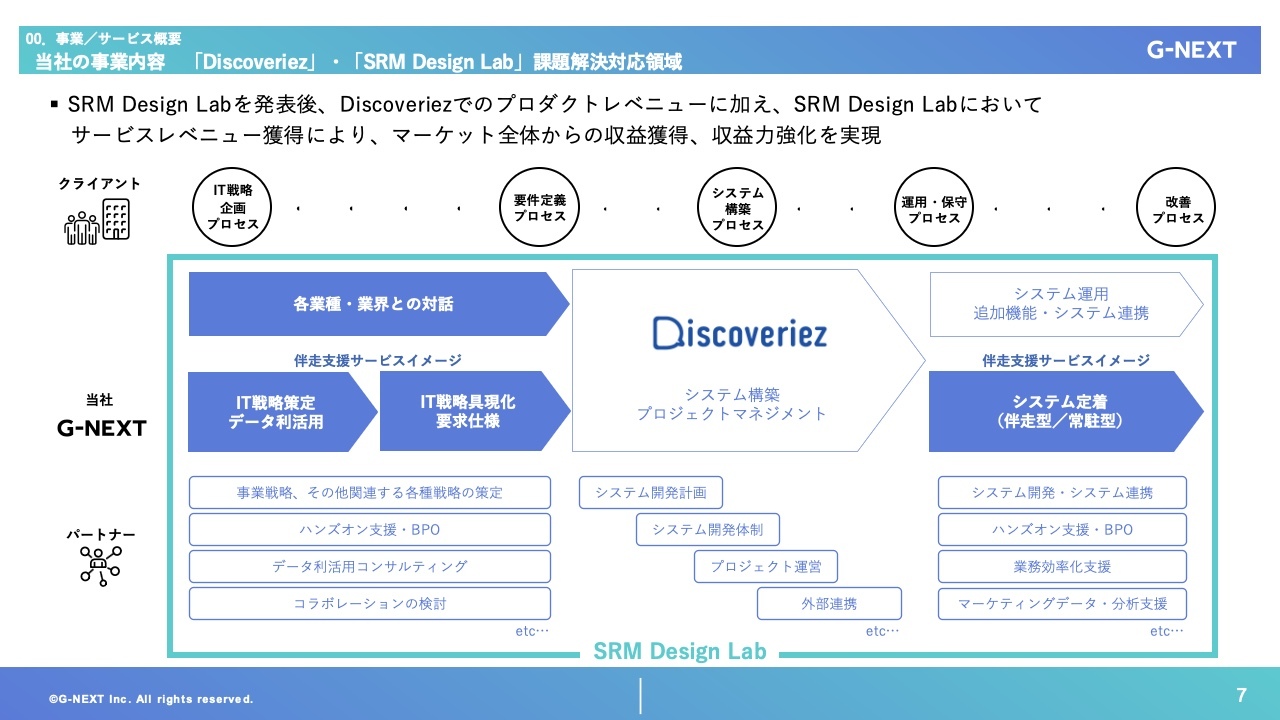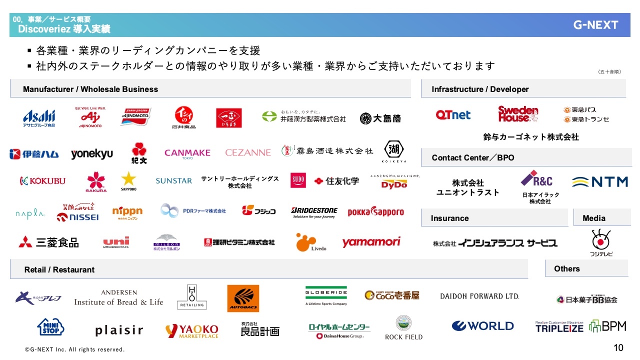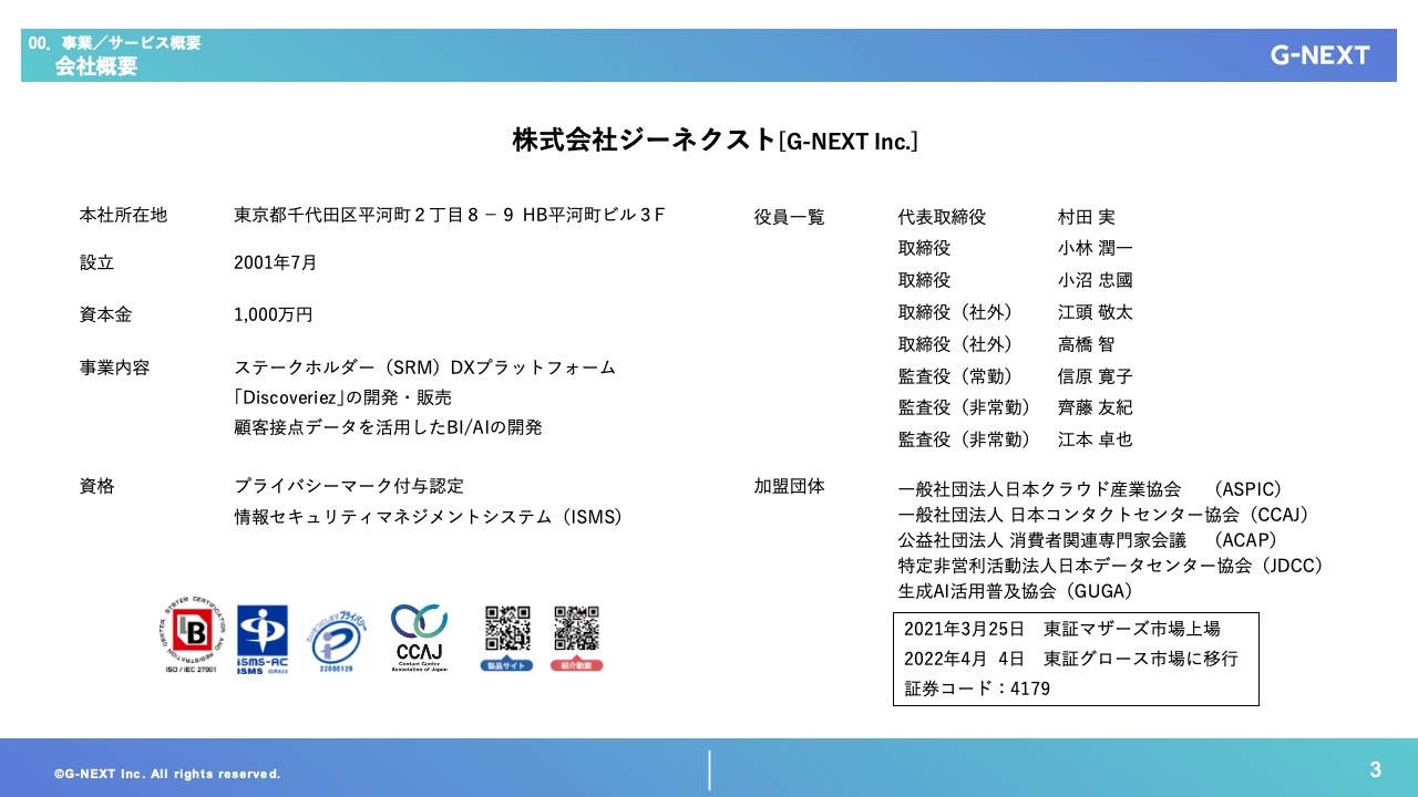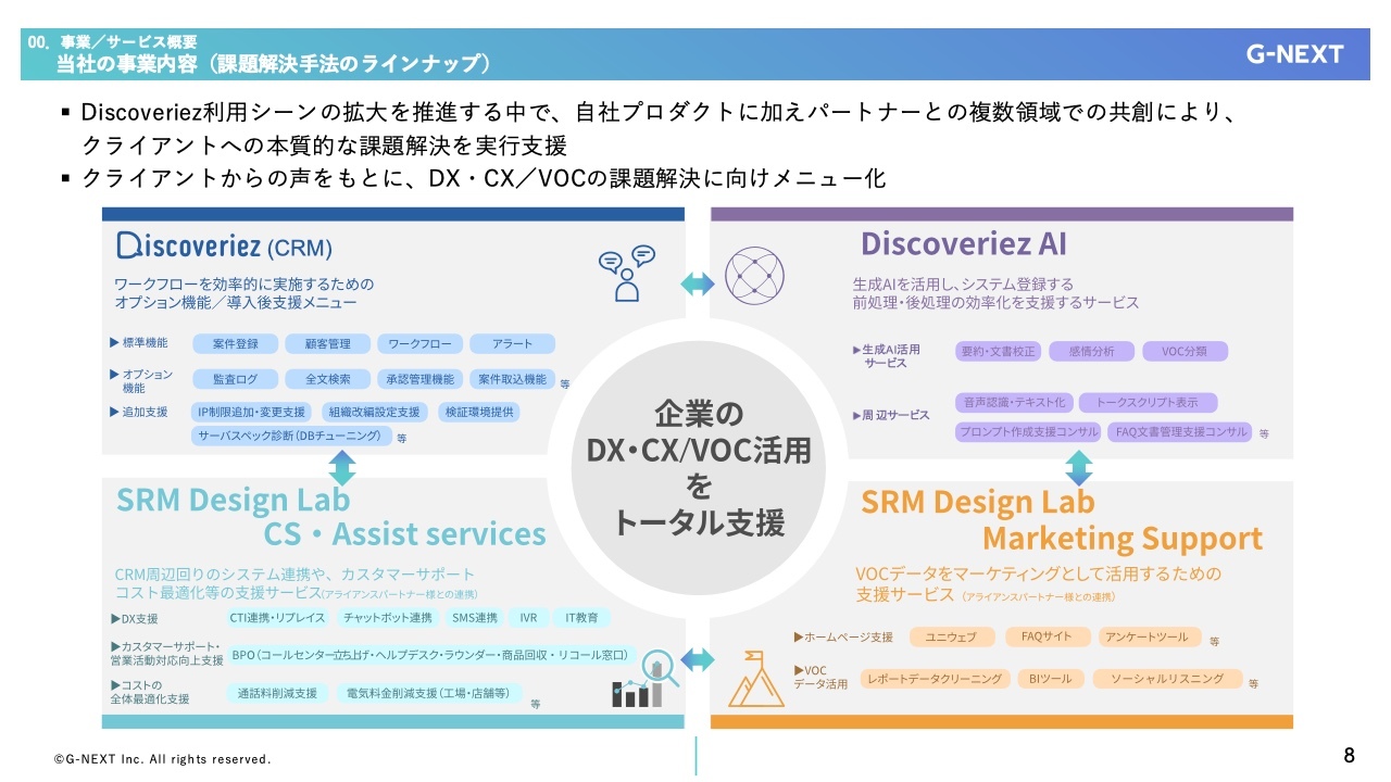 カスタマーセンターやコールセンター向けCRMである「Discoveriez」の提供を中心に、生成AI活用における「Discoveriez AI」などの自社プロダクトに加え、複数領域でのパートナーとの共創により、クライアントの本質的な課題解決を実行支援しています。クライアントの声をもとに、DXやCX、VoCの課題解決に向けてメニュー化しており、市場ニーズに応じた取り組みが強みです。