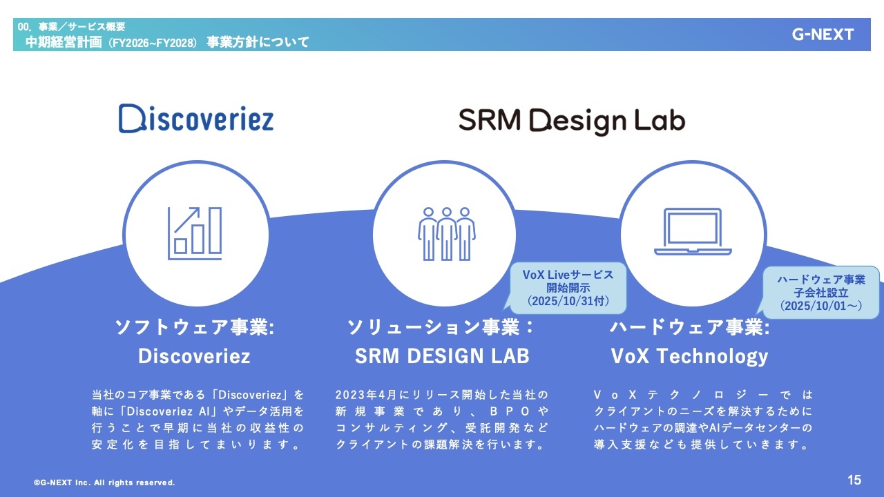 ハードウェアについては、新規顧客だけでなく既存顧客への提供も増加しています。また、10月31日に開示しましたが、「Discoveriez」を活用したクライアントへの実業支援を目的とするライブコマースサービス「VoX Live」の立ち上げを準備しています。