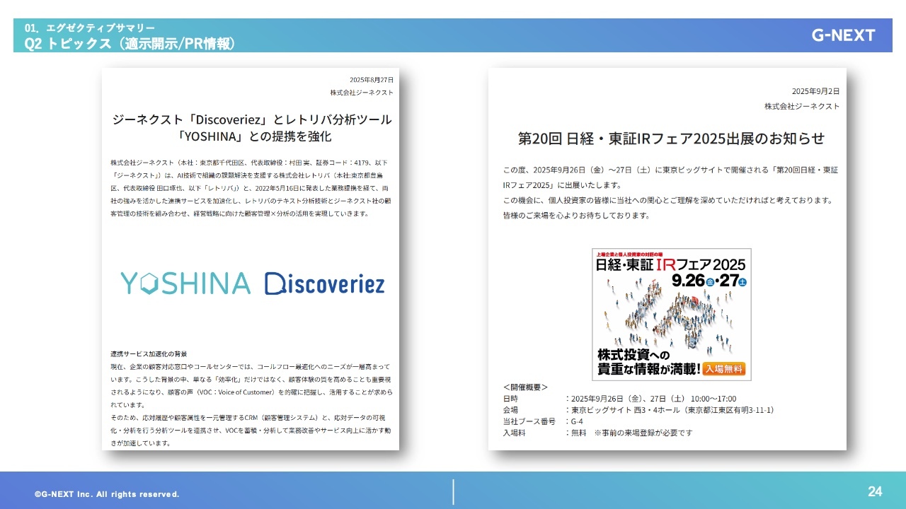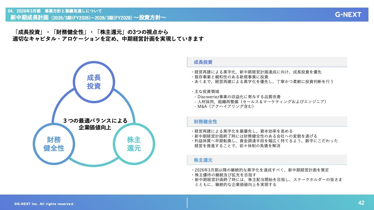 「Discoveriez」については、先ほど品質改善についてお話ししましたが、安定してご利用いただけるようになることが、結果的に当社の収益につながると認識しています。一方、「Discoveriez AI」は今最も注目されているトピックであり、現場の方々が直面している課題に対して、マーケットインのアプローチで対応できる部分です。そのため、これらの分野への投資を促進し、収益化を進めています。