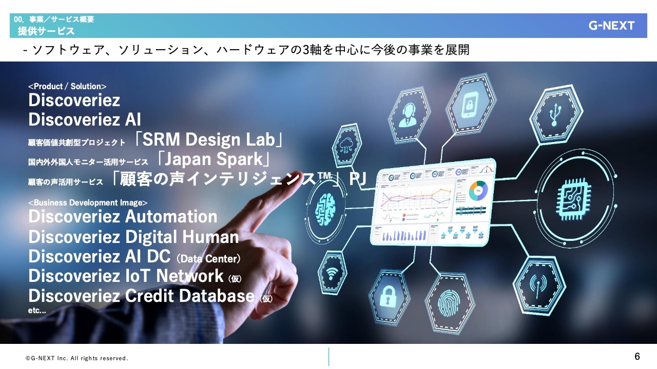 提供サービスとしては、「Discoveriez」というシステムを中心に、AIによる分析サービスやデジタルヒューマン、データセンターをサービスとして提供しています。また、6月に事業譲受した国内外の外国人モニター活用サービス「Japan Spark」など、ステークホルダーの声を中心としたサービスを提供しています。