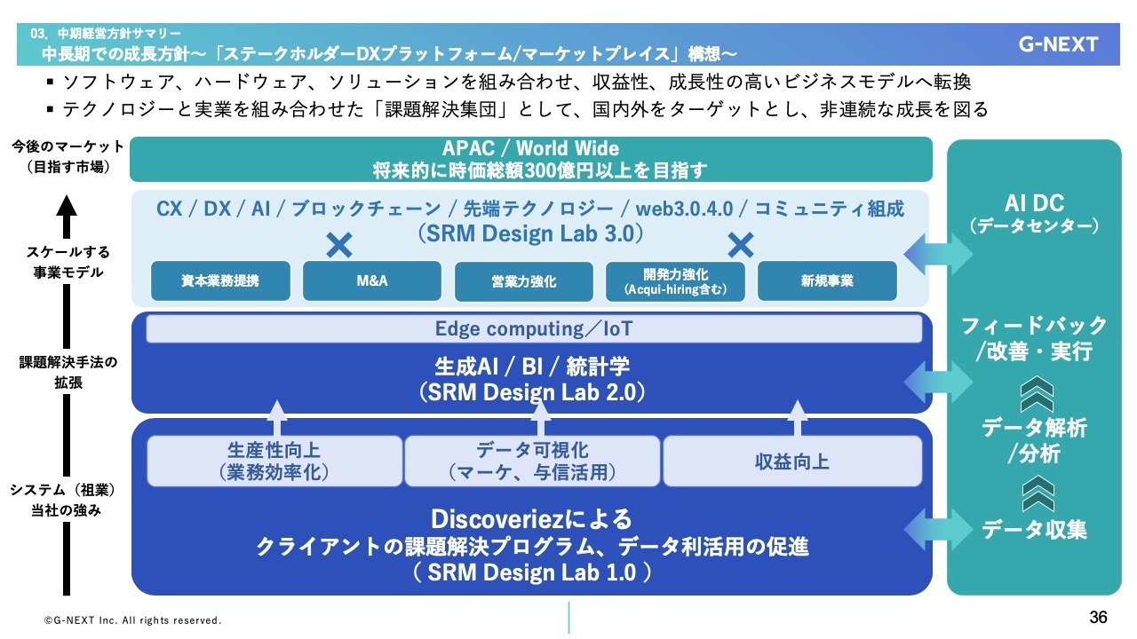また、ハードウェア&ソリューション事業では、既存事業との親和性と収益性を重視し、高収益が期待できる新規事業領域への参入を予定しています。AIデータセンター、ブロックチェーン、Web3.0/4.0、ライブコマースなどを検討しているところです。