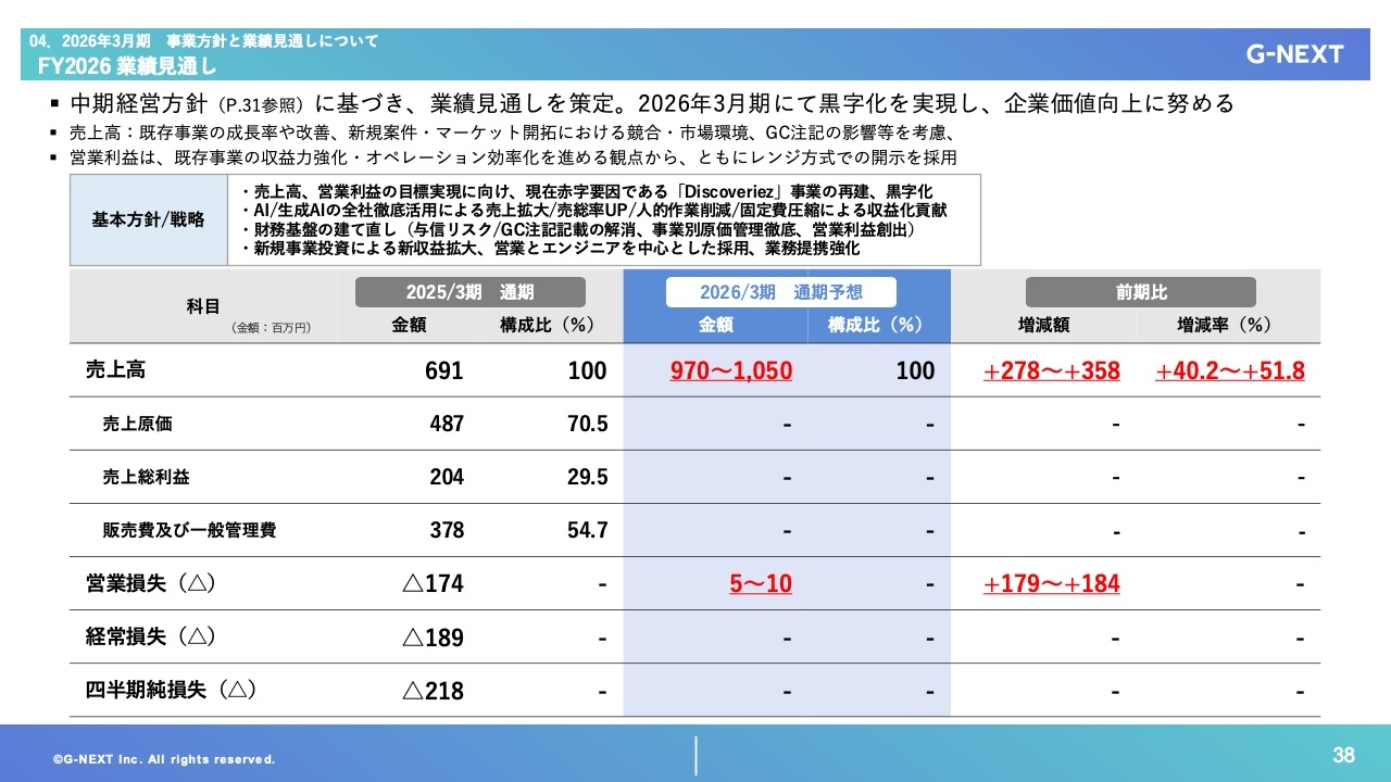 また、AI/生成AIの全社徹底活用による売上拡大、売上総利益率の向上、人的作業の削減や固定費圧縮による収益化への貢献、財務基盤の立て直し、新規事業への投資による新たな収益の拡大、営業とエンジニアを中心とした採用活動や業務提携の強化を挙げています。黒字化に向け、下期以降も邁進する方針であり、現時点で業績目標の修正予定はありません。