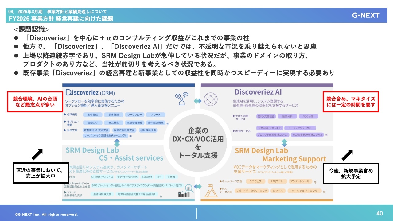 一方、課題としては、既存の「Discoveriez」事業の再建と経営全体の再建、さらに新事業における収益柱の確立を同時かつ迅速、そして大胆に実行する必要があると認識しています。しかし、それは決して容易なことではないと考えています。