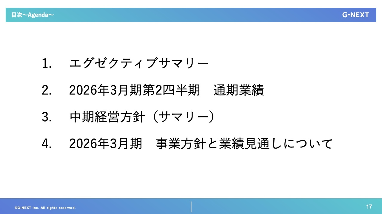 2026年3月期第2四半期決算説明会のアジェンダはスライドのとおりです。
