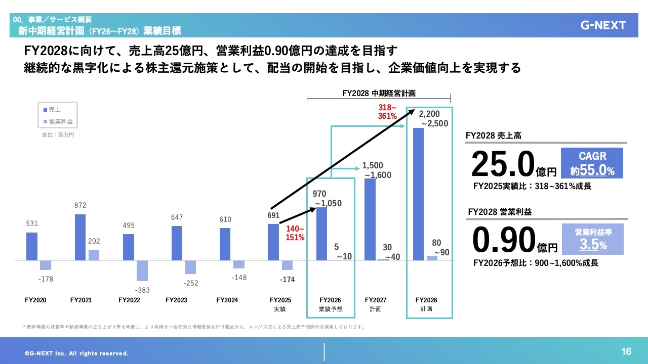 3ヶ年での業績目標は、スライドのとおりです。2028年度に向けて、売上高25億円、営業利益9,000万円以上の達成を目指しています。赤字体質を改善し黒字化を成し遂げた後、現在積み上げているストック売上を中心に、収益が読みやすい会社となるべく事業に邁進していきます。
