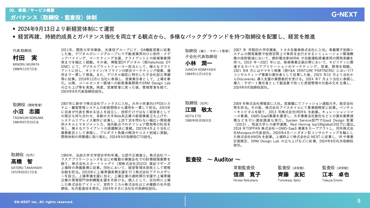 そのほか、経営体制についてはスライドに記載のとおりです。多様なバックグラウンドを持つ取締役を配置し、経営を推進しています。