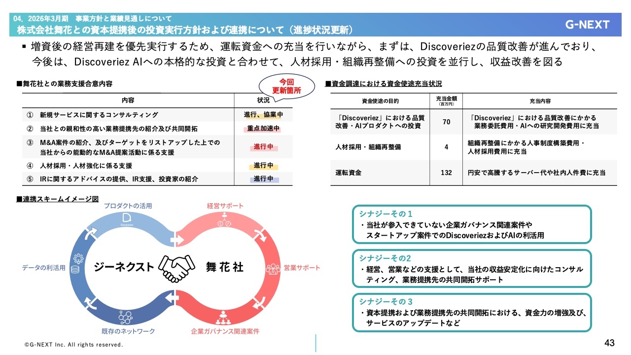 筆頭株主である舞花社との連携も随時進めています。今後は、より成長に向けた投資ができるように、まずは足元の収益改善の実現が急務であると考えています。