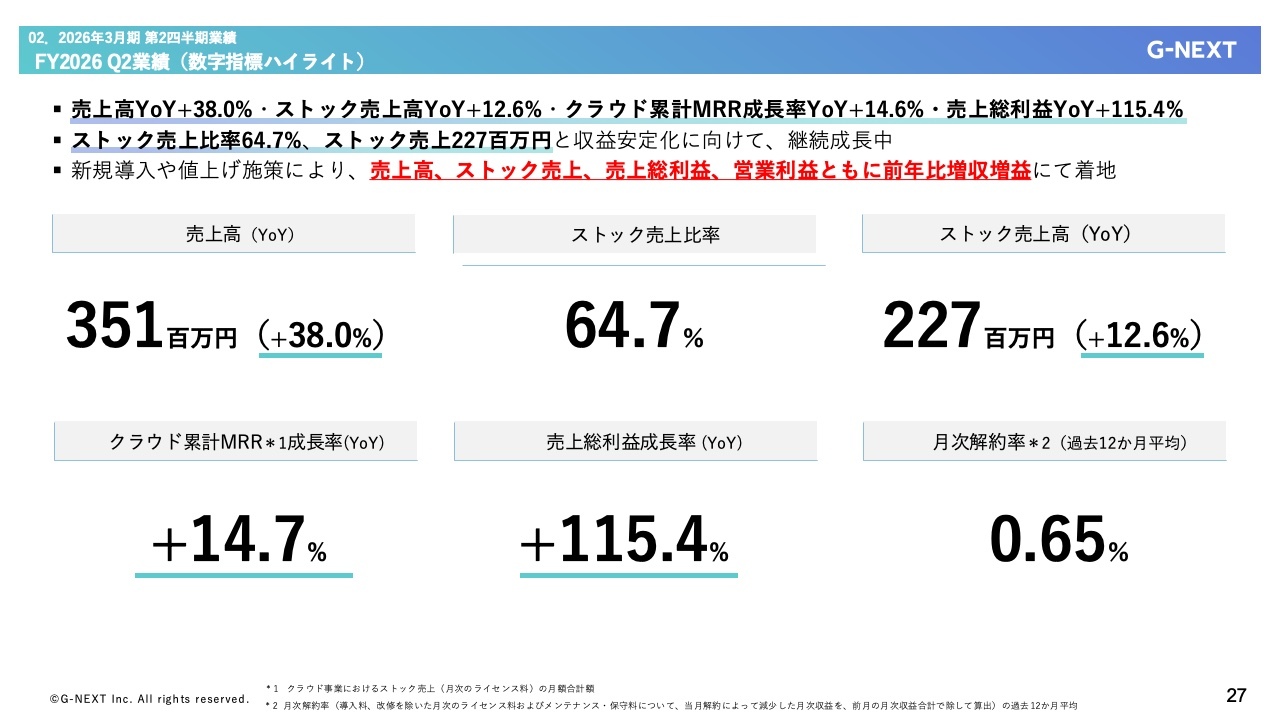 第2四半期の業績についてご説明します。売上高は前年同期比プラス38.0パーセント、ストック売上高は前年同期比プラス12.6パーセント、クラウド累計MRR成長率は前年同期比プラス14.7パーセント、売上総利益成長率は前年同期比プラス115.4パーセントと、収益安定化に向けて継続的に成長しています。