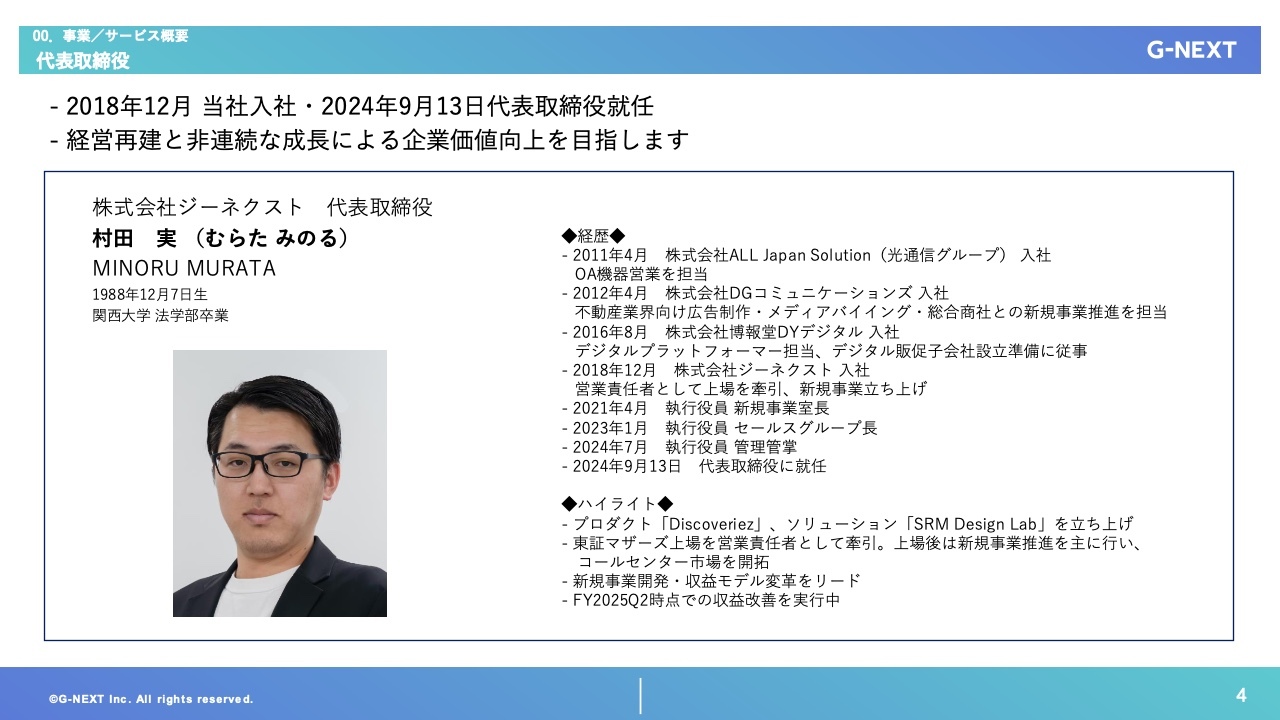 私についてです。当社には2018年12月に入社し、マザーズ上場時には営業責任者として売上と利益を牽引しました。その後、新規事業開発に従事し、コールセンター市場の開拓を中心に取り組みました。当社が上場後に下方修正した後は、営業や管理部門の業務を管掌し、前年9月に代表取締役に選任されました。