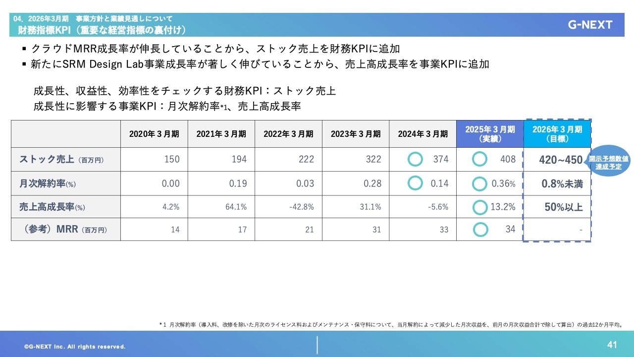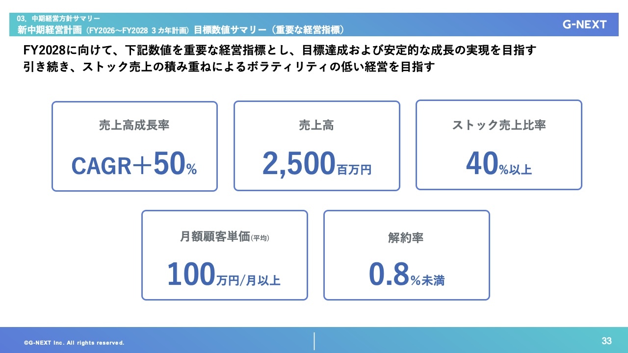 中期経営計画におけるKPIはスライドのとおりです。ストック売上を積み重ねることで、ボラティリティの低い経営を目指しています。