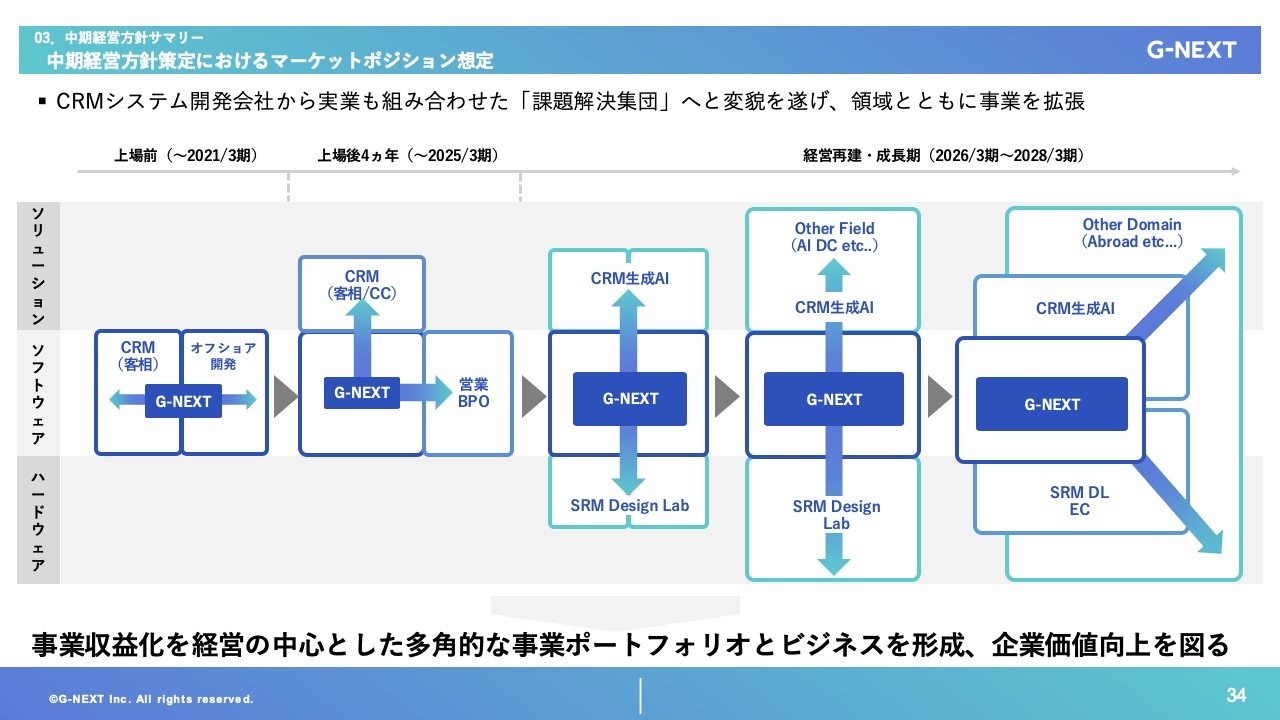 マーケットポジションについては、CRMシステム開発会社から実業も組み合わせた「課題解決集団」へと変貌を遂げ、領域拡大とともに事業を拡張していきます。事業収益化を経営の中心に据え、多角的な事業ポートフォリオを形成しながら、企業価値向上を図ります。