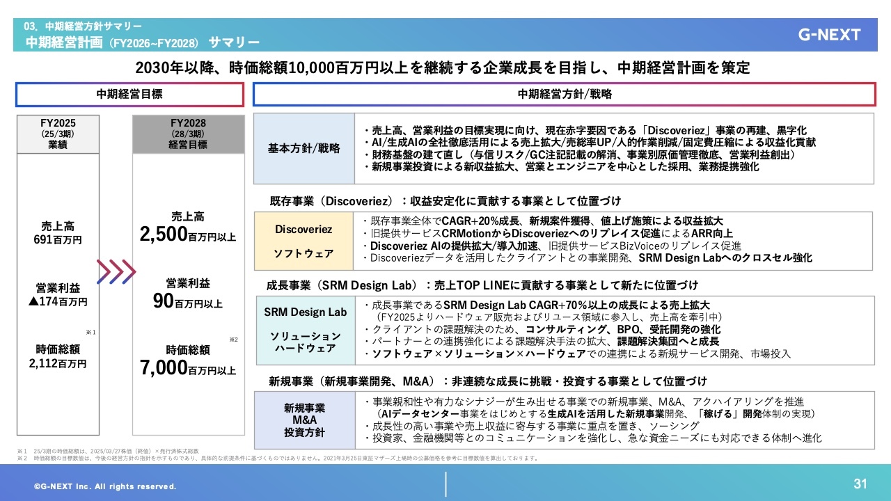 中期経営方針のサマリーについてご説明します。2030年以降、時価総額100億円以上を継続する企業成長を実現すべく、引き続き、事業活動を行います。