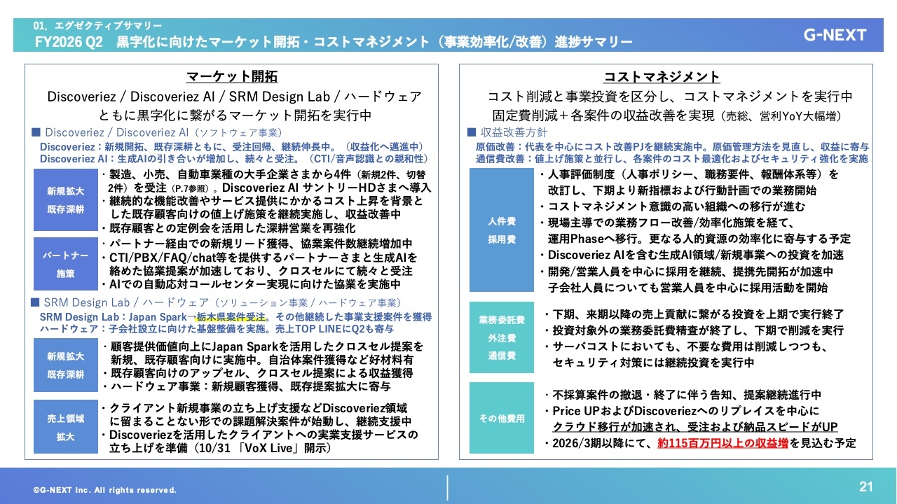 FY2026 Q2 黒字化に向けたマーケット開拓・コストマネジメント(事業効率化/改善)進捗サマリー