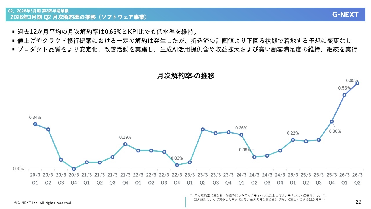 過去12ヶ月平均の月次解約率は0.65パーセントと、KPI比でも低水準を維持しています。値上げやクラウド移行提案に伴う一定の解約は発生しましたが、織り込み済みの計画値を下回る状態で着地する見通しに変更はありません。