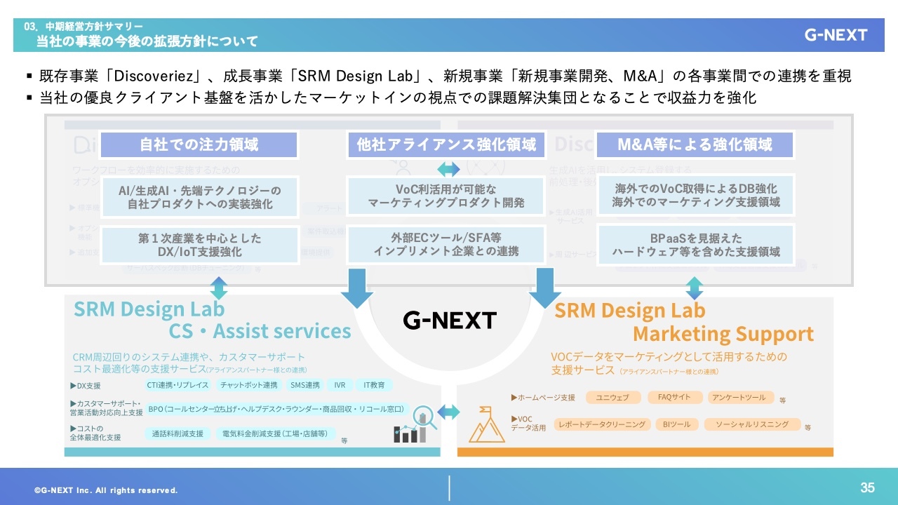 今後の拡張方針としては、自社の注力領域、他社とのアライアンス強化領域、M&Aによる強化領域を明確にし、当社の優良なクライアント基盤を活かしてマーケットインの視点で課題解決に取り組むことで、収益力を強化していきます。