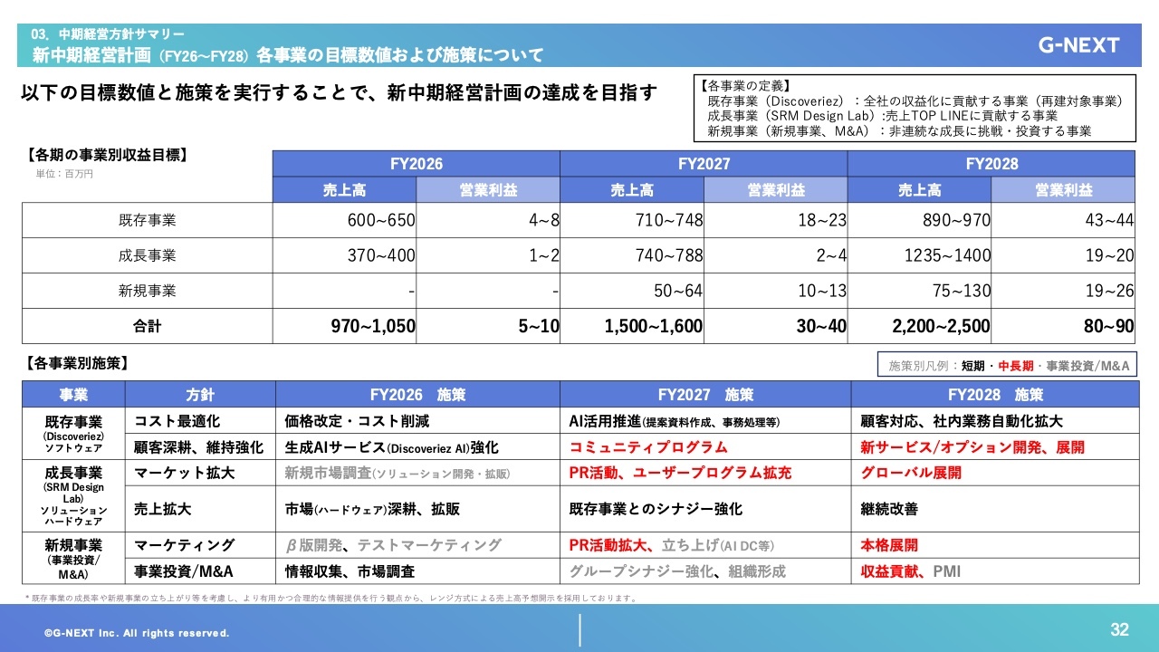 新中期経営計画 (FY26~FY28) 各事業の目標数値および施策について