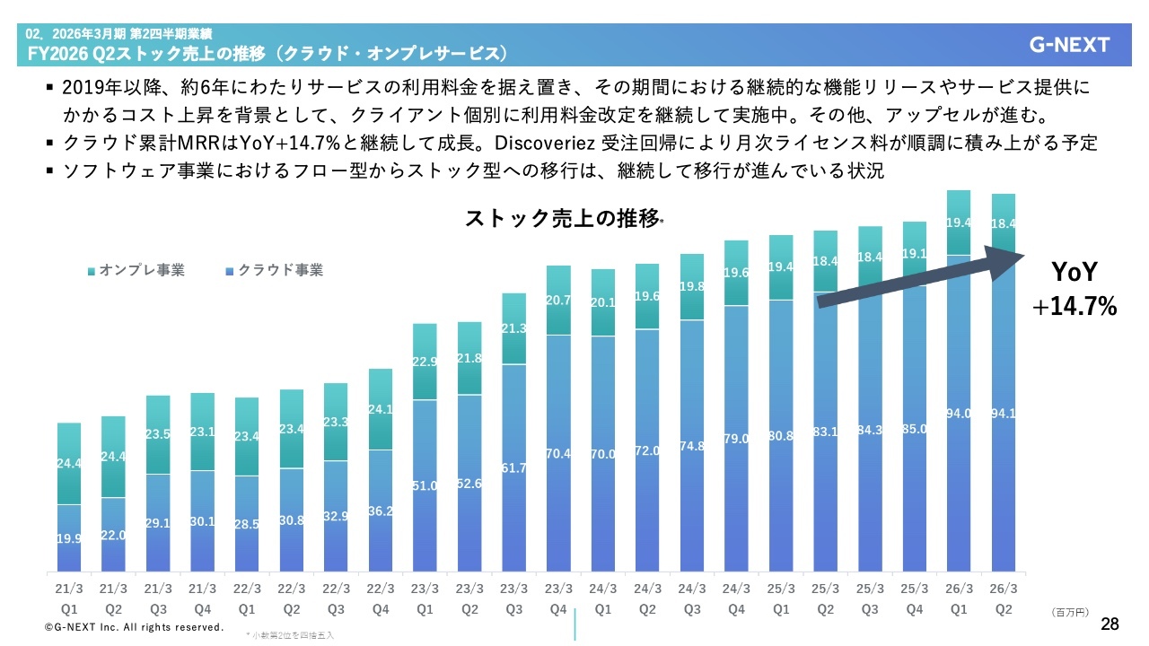 FY2026 Q2ストック売上の推移(クラウド・オンプレサービス)
