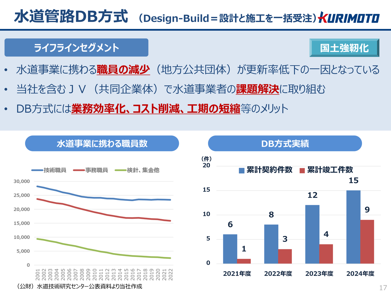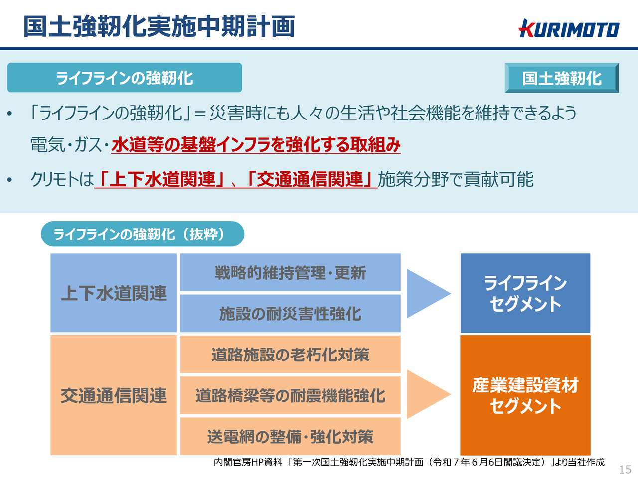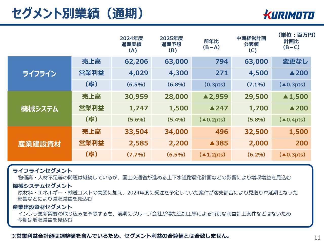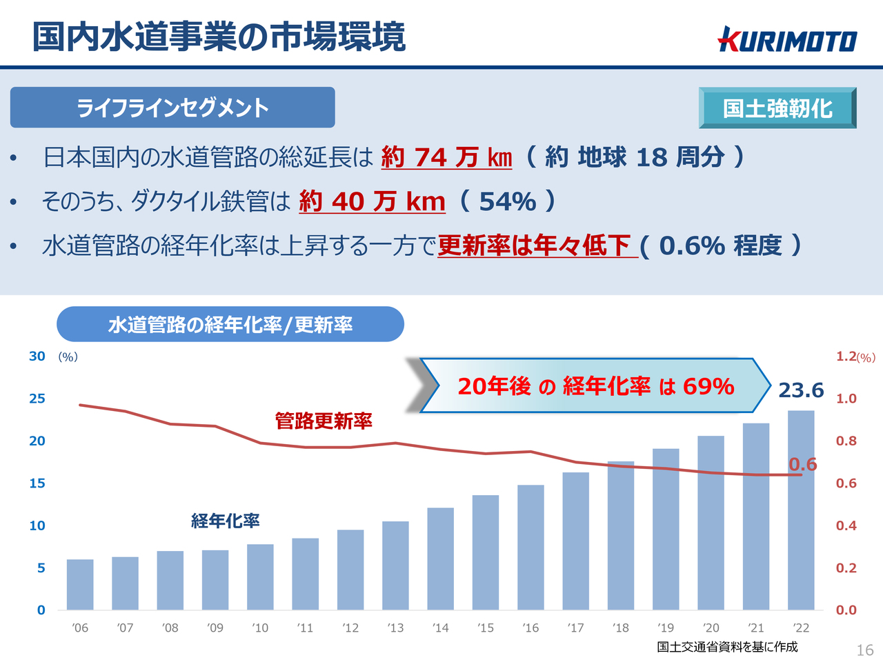 ライフラインセグメントは、引き続き物価高や水道事業に携わる人材不足などの諸問題が継続しているものの、国土交通省が進める上下水道耐震化計画の影響が少しずつ表れることも期待されるため、増収増益を見込んでいます。