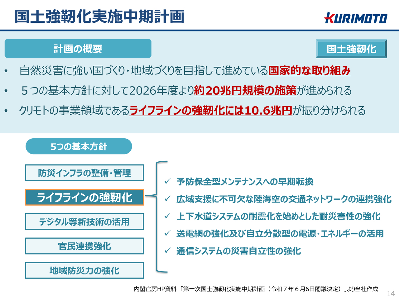 次に、当社事業に関連するトピックスをご紹介します。まず、2025年6月に閣議決定された国土強靱化実施中期計画の概要についてご説明します。