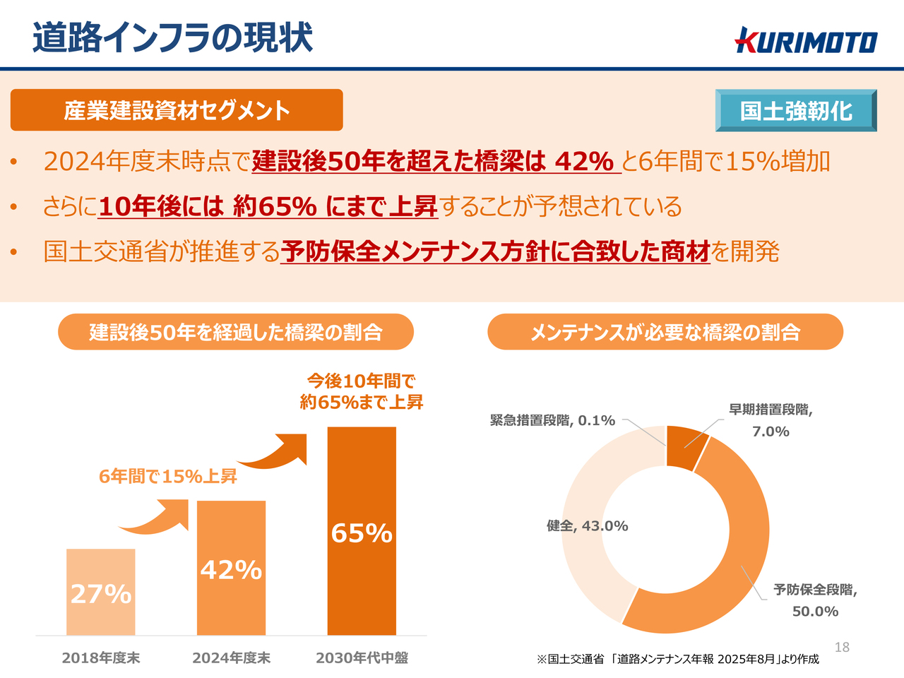 続いて、産業建設資材セグメントについてです。老朽化が進んでいるのは水道管だけではなく、道路インフラも同様です。高度経済成長期に大規模なインフラ整備が行われた影響で、日本国内には橋梁がおよそ73万ヶ所存在し、2024年度末にはその42パーセントが建設後50年を経過しています。
