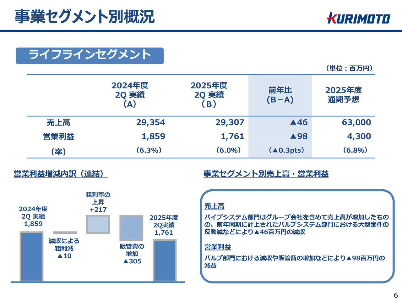 ライフラインセグメントにおいては、売上高はパイプシステム部門でグループ会社を含め好調に推移しましたが、バルブシステム部門で昨年度に利益率の高い大型の民需案件があり、今期はその反動の影響により、前年比4,600万円減収の293億700万円となりました。