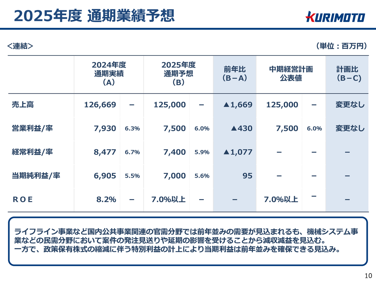 続きまして、2025年度の通期業績予想についてご説明します。売上高、営業利益、経常利益は前年比で減収減益を予想していますが、当期純利益については政策保有株式の縮減に伴う特別利益の計上などにより、前年並みを計画しています。