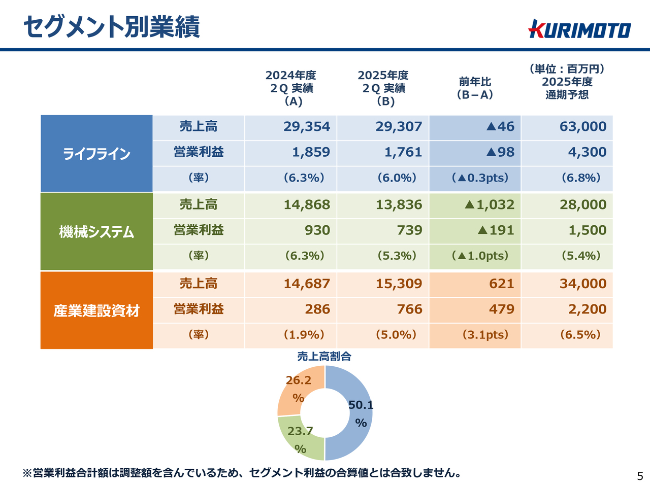 各セグメントの業績についてはスライドのとおりです。グループ売上高の構成割合は、ライフラインセグメントが約50パーセント、機械システムセグメントと産業建設資材セグメントがそれぞれ約25パーセントです。